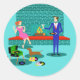 Este Casal Retro com Dog Stickers parece uma cena de uma comédia romântica. O estilo da década de 1960, design de arte minimalista apresenta um casal atraente desfrutando de uma noite romântica em casa. A sala sofisticada apresenta de forma destacada um aqua e uma lareira de tijolos com uma borda vermelha brilhante. Uma linda mulher ruiva vestindo um vestido rosa brilhante está empolgada na borda. Ela está desfrutando de um martini com uma azeitona flutuante, um fogo rugido, boa música, e a empresa um homem alto, escuro e bonito. O homem está vestindo um terno azul e gravata vermelha. Seu copo de martini é criado para brindar seu charmoso companheiro. Por outro lado, ele está segurando um álbum de vinil. Aos seus pés, vemos um dachshund adorável vestindo um colar vermelho. O cão brincalhão está caminhando na direção de um toca-discos verde com pernas de eixo laranja. No chão, há um grupo colorido de registros divertidos, ecléticos, vinílicos. Saúde! Aqui está a noite perfeita em casa.