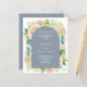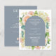Convites de casamento azuis e empoeirados apresentam seus detalhes na frente e atrás em letras brancas chic. Lindas flores de aquarela - hipnanias brancas e verdes, rosas cor-de-rosa e creme, margaridas, pequenos caules e folhas - na frente com suas informações sobre uma camada arcada. Impresso no barato, em papel de 110 lb. **ENVELOPES BRANCOS são um custo adicional. O Serviço de Design ao Vivo pode ajudá-lo com o layout ou cores do design, se necessário. CORRESPONDENDO a itens na nossa loja.