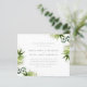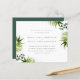 Este convite para casamento de temas tropicais é perfeito para comemorações de verão ao ar livre. Folhas de palmeira de aquarelas e de eucalipto verde com pó de folha de ouro. Sua informação de casamento é mostrada com uma tipografia mínima chic contra um fundo branco. Invertendo para um fundo verde caçador. Como parte da seleção do orçamento aqui no Zazzle, estes convites não vêm com envelopes nem ajustado de forma suave em um envelope de tamanho padrão. O tamanho mais próximo é A6, mas haverá um intervalo de aproximadamente meio polegada. Se não se importa com a falta de humor, você poderia usar envelopes A6 tão disponíveis. Caso contrário, esse design pode ser transferido para um formato padrão 5x7 (que vem com envelopes) usando a ferramenta de transferência design. Como guia geral, a partir do momento do escrevendo, 100 convites orçamentários (incluindo um desconto por volume) custariam cerca de US$ 39, enquanto 100 convites padrão 5x7, incluindo envelopes, custariam aproximadamente US$ 135. Sua quilometragem pode variar dependendo dos códigos de promocionais disponíveis do Zazzle, das vendas em todo o site ou das mudanças nos preços.