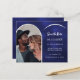 Uma foto Salve o cartão de data do seu casamento Adicione sua própria foto de tamanho vertical. Fotografia do arco dourado. Um fundo azul marinho, texto branco. A cor azul é irregular. Personalize e adicione seus nomes e a data.