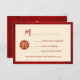 Um símbolo de felicidade dupla dourado num fundo vermelho brilhante. Cartão de Casamento Chinês RSVP. Na parte de trás está um código qr digitalizável para o seu site de casamento.