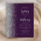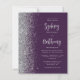 A borda esquerda deste elegante convite de casamento moderno apresenta uma borda falsa de prata. O texto personalizável combina o script caligráfico de cinzas prateadas pálidas e sans serif em um fundo roxo escuro. O verso apresenta um design púrpura e prateado.