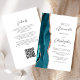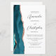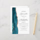 A borda esquerda deste elegante convite de casamento moderno apresenta uma cor azul-lacrimogênea agata borda com falsa rosa dourada. O texto personalizável combina o script de cinza de carvão e as fontes sans serif em um fundo branco. O verso fornece espaço para detalhes do casamento em um fundo branco sólido, junto com um código QR que os convidados podem digitalizar para visitar seu site e RSVP, o que economiza o custo de imprimir e enviar cartões RSVP separados.