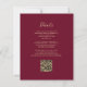 A borda esquerda deste elegante convite de casamento moderno apresenta uma borda falsa de ouro. O texto personalizável combina manuscritos dourados, copperplate e fontes itálicas em um fundo vermelho arrojado. O verso fornece espaço para detalhes do casamento em um fundo de burgundy sólido, junto com um código QR que os convidados podem fazer uma varredura para visitar seu site e RSVP.