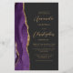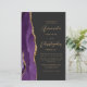 A borda esquerda deste elegante convite de casamento moderno apresenta uma cor d'água roxa, borda agitada, aparada com falso brilho dourado. O texto personalizável combina o script dourado e as fontes sans serif em um fundo preto de slate. O verso fornece espaço para detalhes do casamento em um fundo preto de slate sólido, junto com um código QR que os convidados podem digitalizar para visitar seu site e RSVP, o que economiza o custo de imprimir e enviar cartas RSVP separadas.