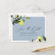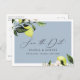 Limões botânicos, folhas e flores de coloração aquosa elegantes, casamento, salvo o cartão postal. A placa apresenta um gráfico elegante de caligrafia "Salvar a Data", em frente e atrás.