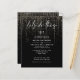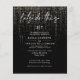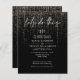 Convites de casamento acessíveis não precisam ser chatos - Guarnição ousada e espelhada em champanhe cai pela página, em caligrafia manuscrita está "vamos fazer isso" - iniciais do casal no topo - o resto do texto é simples e limpo - tudo em um fundo preto. Papelaria de casamento elegante.