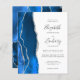 A borda esquerda deste elegante convite de casamento moderno apresenta uma cor azul real de água agada borda com falso brilho prateado. O texto personalizável combina manuscrito, copperplate e fontes itálicas em cinzas de carvão em um fundo branco. O verso apresenta um design de agata real e prateado.