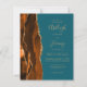 A borda esquerda deste elegante convite de casamento moderno apresenta uma cor de água laranja queimada, aparada com falsa brilho dourado. O texto personalizável combina manuscrito dourado, fontes em copperplate e itálico em um fundo azul lacrimogêneo. O lado inverso apresenta um design agate correspondente.