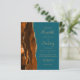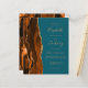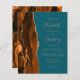 A borda esquerda deste elegante convite de casamento moderno apresenta uma cor de água laranja queimada, aparada com falsa brilho dourado. O texto personalizável combina manuscrito dourado, fontes em copperplate e itálico em um fundo azul lacrimogêneo. O lado inverso apresenta um design agate correspondente.