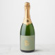 Vinho espumante de casado com borboleta ouro, nomes de casais e data de casamento sobre fundo verde sage