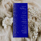 A borda esquerda deste elegante programa de casamento moderno apresenta um design brilhante falso prateado. O texto personalizável combina manuscrito branco, fontes em copperplate e itálico em um fundo azul real.