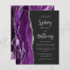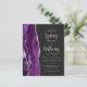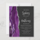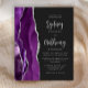 A borda esquerda deste elegante convite de casamento moderno apresenta uma cor d'água roxa, borda agitada com falso brilho prateado. O texto personalizável combina o script de caligrafia de cinza prateada e sans serif em um fundo fora do preto. O verso apresenta um design de agata prateado e roxo correspondente.