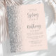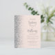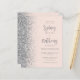 A borda esquerda deste elegante convite de casamento moderno apresenta uma borda falsa de prata. O texto personalizável combina o script de caligrafia de cinza e sans serif em um fundo cor-de-rosa embutido. O verso apresenta um pincel e design prateado correspondentes.