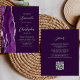 A borda esquerda deste elegante convite de casamento moderno apresenta uma cor d'água roxa, borda agitada, aparada com falso brilho dourado. O texto personalizável combina o script dourado e as fontes sans serif em um plano de fundo roxo. O verso fornece espaço para detalhes do casamento em um fundo roxo sólido, junto com um código QR que os convidados podem digitalizar para visitar seu site e RSVP, o que economiza o custo de imprimir e enviar cartões RSVP separados.