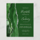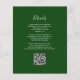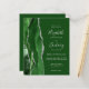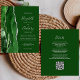 A borda esquerda deste elegante convite de casamento moderno apresenta um caçador de aquarela verde agata borda com falso brilho prateado. O texto personalizável combina manuscritos, placas e fontes itálicas em cinzas prateadas leves em um fundo verde caçador. O verso fornece espaço para detalhes do casamento em um fundo verde sólido, junto com um código QR que os convidados podem digitalizar para visitar seu site e RSVP.