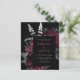 Este elegante e modesto convite de casamento apresenta um buquê floral romântico e luxuoso em vermelho burgundy, com folha de cor prateada e folhagem brilhante num fundo negro. Personalize o texto da lata de burlagem pálida e da cinza prateada em fontes na moda num retângulo escuro. O verso fornece espaço para detalhes do casamento em um fundo preto sólido, junto com um código QR que os convidados podem digitalizar para visitar seu site e RSVP.