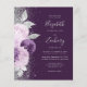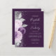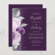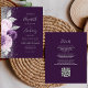 O canto esquerdo deste elegante convite para casamento moderno apresenta um buquê floral em tons de roxo e lavanda, aparado com folha de falso prateado e folhagem falsa e aspergido com brilho de prata. O texto personalizável combina o script de escrita manual de cinzas prateadas pálidas, fontes copperplate e itálico em um fundo roxo. Adicione mais detalhes no verso, juntamente com um código QR para ajudar seus convidados a visitar seu site de casamento.