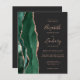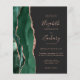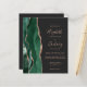 A borda esquerda deste elegante convite de casamento moderno apresenta uma esmeralda verde aquarela agate borda aparada com falsa rosa dourada. O texto personalizável combina a letra rosa-rosa, a letra copperplate e a letra itálico num fundo preto de ardósia. O verso oferece espaço para detalhes do casamento, juntamente com um código QR que os convidados podem digitalizar para visitar seu site e RSVP, o que economiza o custo de impressão e envio de cartões RSVP separados.
