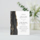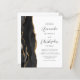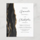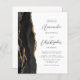 A borda esquerda deste elegante convite de casamento moderno apresenta uma coloração aquosa preta, borda agitada, aparada com falso brilho dourado. O texto personalizável combina o script de cinza de carvão e as fontes sans serif em um fundo branco. O verso fornece espaço para detalhes do casamento em um fundo branco sólido, junto com um código QR que os convidados podem digitalizar para visitar seu site e RSVP, o que economiza o custo de imprimir e enviar cartões RSVP separados.