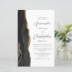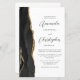 A borda esquerda deste elegante convite de casamento moderno apresenta uma coloração aquosa preta, borda agitada, aparada com falso brilho dourado. O texto personalizável combina o script de cinza de carvão e as fontes sans serif em um fundo branco. O verso fornece espaço para detalhes do casamento em um fundo branco sólido, junto com um código QR que os convidados podem digitalizar para visitar seu site e RSVP, o que economiza o custo de imprimir e enviar cartões RSVP separados.