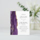 A borda esquerda deste elegante convite de casamento moderno apresenta uma cor d'água roxa, borda agitada, aparada com falso brilho dourado. O texto personalizável combina o script de cinza de carvão e as fontes sans serif em um fundo branco. O verso fornece espaço para detalhes do casamento em um fundo branco sólido, junto com um código QR que os convidados podem digitalizar para visitar seu site e RSVP, o que economiza o custo de imprimir e enviar cartões RSVP separados.