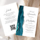 A borda esquerda deste elegante convite de casamento moderno apresenta uma cor azul-lacrimejante agata borda com falso brilho prateado. O texto personalizável combina o script de cinza de carvão e as fontes sans serif em um fundo branco. O verso fornece espaço para detalhes do casamento em um fundo branco sólido, junto com um código QR que os convidados podem digitalizar para visitar seu site e RSVP, o que economiza o custo de imprimir e enviar cartões RSVP separados.