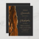 A borda esquerda deste elegante convite de casamento moderno apresenta uma laranja queimada e uma aquarela ferrugem borda agitada com falsa brilho de ouro. O texto personalizável combina o script dourado e as fontes sans serif em um fundo preto de slate. O verso fornece espaço para detalhes do casamento em um fundo preto de slate sólido, junto com um código QR que os convidados podem digitalizar para visitar seu site e RSVP, o que economiza o custo de imprimir e enviar cartas RSVP separadas.