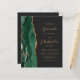 A borda esquerda deste elegante convite de casamento moderno apresenta uma esmeralda verde aquarela agate borda com falsa brilho dourado. O texto personalizável combina o script dourado e as fontes sans serif em um fundo preto de slate. O verso fornece espaço para detalhes do casamento em um fundo preto de slate sólido, junto com um código QR que os convidados podem digitalizar para visitar seu site e RSVP, o que economiza o custo de imprimir e enviar cartas RSVP separadas.