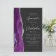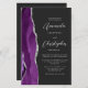 A borda esquerda deste elegante convite de casamento moderno apresenta uma cor d'água roxa, borda agitada com falso brilho prateado. O texto personalizável combina o script de cinza prateada e as fontes sans serif em um fundo fora do preto. O verso fornece espaço para detalhes do casamento em um fundo sólido fora do preto, junto com um código QR que os convidados podem digitalizar para visitar seu site e RSVP, o que economiza o custo de imprimir e enviar cartões RSVP separados.