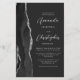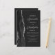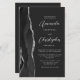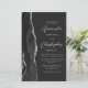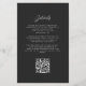 A borda esquerda deste elegante convite de casamento moderno apresenta uma coloração aquosa preta e borda agitada com falso brilho prateado. O texto personalizável combina o script de cinza prateada e as fontes sans serif em um fundo fora do preto. O verso fornece espaço para detalhes do casamento em um fundo sólido fora do preto, junto com um código QR que os convidados podem digitalizar para visitar seu site e RSVP, o que economiza o custo de imprimir e enviar cartões RSVP separados.