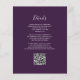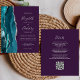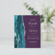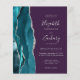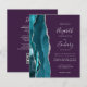 A borda esquerda deste elegante convite de casamento moderno apresenta uma cor azul-lacrimejante agata borda com falso brilho prateado. O texto personalizável combina escrita manual, placa de impressão e fontes itálicas em cinzas prateadas em um fundo roxo. O verso fornece espaço para detalhes do casamento em um fundo roxo sólido, junto com um código QR que os convidados podem digitalizar para visitar seu site e RSVP, o que economiza o custo de imprimir e enviar cartões RSVP separados.