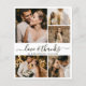 Orçamento Elegante e moderno obrigado de casamento que você folga com um layout de colagem de seis fotos — perfeito para mostrar seus momentos favoritos do grande dia. Esta modelo minimalista inclui a frase "Amor e obrigados" num gracioso roteiro caligráfico com letras de mão com detalhes de cauda de swash, impresso a preto sobre fundo branco limpo. Personalize com seus nomes, fotos de casamento e um obrigado sincero que você manda. Preferir escrever seu bilhete à mão? Basta remover o texto de exemplo para criar espaço. Um jeito bonito e na moda para qualquer casal novo dizer obrigado de você. Sinta-se à vontade para me contactar se precisar de assistência para personalizar o seu design.