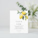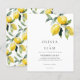 Este convite para o casamento apresenta um design simples e elegante com ilustrações de cor d'água de limões e folhas no topo. O texto do convite está centrado e usa uma fonte serif clássica, anunciando o casamento de dois indivíduos e convidando convidados a comemorar. A estética geral é fresca e sofisticada, enfatizando um tema natural e minimalista.
