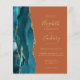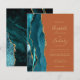 A borda esquerda deste elegante convite de casamento moderno apresenta uma coloração aquosa lacrimogênea aparada com uma falsa brilha de ouro. O texto personalizável combina manuscrito dourado, fontes em copperplate e itálico em um fundo laranja queimado. O verso apresenta um design de chaleira e de agata dourada.
