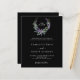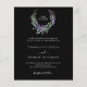 Fundo preto. Uma coroa floral feita de flores lavandas e de eucalipto verde de cor aquosa. Personalize e adicione suas iniciais, nomes e detalhes do monograma. Texto branco. 1 folha = 1 convite impresso de borda a borda.