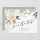 Cartão de aviso de casamento com flores e folhagens em tons de rosa água-marinho e pêssego.