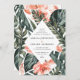 Convite para casamento de folhagem de folha rosa e tropical. Parte de uma fantástica suíte de casamento elegante. Coleção tropical verde moderno, azul e coral.