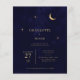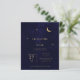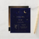 Um convite de casamento celestial moderno minimalista apresenta uma design simples e elegante. Inclui uma lua de folha de ouro e estrelas que brilham suavemente, colocadas sobre um fundo limpo com uma foto no fundo que pode ser personalizada. O convite usa a tipografia serif clássica, que adiciona um toque tradicional e formal com seu estilo limpo e limpo. A combinação de design moderno, detalhes brilhantes de ouro e fontes eternos torna o convite bonito e convidativo, perfeito para anunciar um dia especial e elegante de casamento.