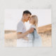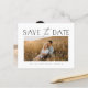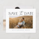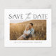 Um Casamento de Foto de Orçamento Elegante Salve a Data com o tipo de script moderno e o layout simples na frente. O verso tem uma foto e detalhes adicionais. Clique no botão editar para personalizar este design.