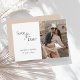 Casamento de Foto com Script de Blush Moderno Salve o Cartão de Data - Anuncie seu dia em estilo com este moderno salve o cartão de data com script minimalista e um layout de foto de cheio. Um quadro de pincel suave adiciona calor e elegância à sua papelaria de casamento. Perfeito para temas de casamento românticos, modernos ou neutros.