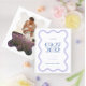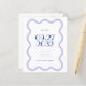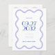 Este casamento salvar o cartão de data é uma borda ondulada. Ele usa cores calmas como lavanda inspirada em campos de lavanda. As fontes divertidas e na moda adicionam um toque de elegância, e as palavras no centro são destacadas em azul brilhante para um pop divertido de cor e usam um tamanho de fonte maior.