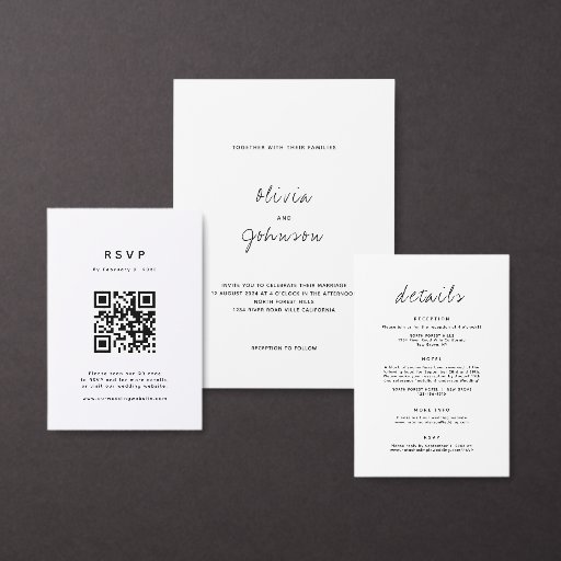 Este convite para o casamento apresenta um design limpo e minimalista com um fundo branco, tipografia moderna e uma escrita manuscrita para os nomes do casal. A frente enfatiza a simplicidade e a elegância, enquanto a parte de trás exibe uma foto em preto-e-branco do casal enquadrada por uma borda branca, acrescentando um toque pessoal e contemporâneo.