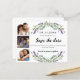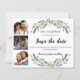 Decorado com flores de lavanda e verde de eucalipto. A Guardar o cartão de data para o seu casamento. O texto: Salvar a Data é gravado com um script de estilo com letra de tendência grande. Personalize e adicione 3 fotos. 1 folha = 1 Salve a data da borda impressa para a borda.