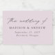 Os rótulos modernos do vinho espumante de casamento destacam a frase "o casamento de", exibida em um roteiro elegante de caligrafia negra em um fundo roxo de lavanda leve. Personalize as etiquetas de vinho espumante da lavanda com seus nomes, data do casamento e local do casamento. As simples etiquetas de vinho espumante de casamento são perfeitas para usar em recepções de casamento, jantadas de ensaio e festas de noivado.