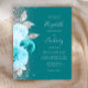 O canto esquerdo deste elegante convite para casamento moderno apresenta um buquê floral em tons de turquesa e azul claro, aparado com folha de falso prateado e folhagem falsa e aspergido com brilho de prata. O texto personalizável combina o script de escrita manual de cinzas de prata pálida, fontes copperplate e itálico em um fundo de turquesa. O verso apresenta uma turquesa e um design floral prateado.