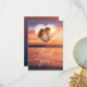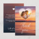 Este cartões de agradecimentos de coração apresenta uma foto quente do pôr do sol por Destei em tons laranja e roxos. A frente inclui uma área de fotos em forma de coração para seu casamento ou foto de casal favorito com o texto elegante "Obrigado" embaixo. O verso oferece espaço para uma mensagem pessoal, fechando com "Com todo o nosso amor" seguido dos seus nomes e de um sutil detalhe cardíaco acima. Uma bela maneira de expressar sua gratidão com um toque romântico e inspirado na natureza.