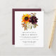 Um bonito buquê de outono de um girassol amarelo, um púrpura e uma hidrangea branca estão no topo deste convite de casamento moderno. Faz parte da coleção Sunflower e Burgundy.