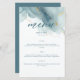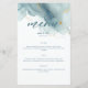 Um modelo de cardápio de praia que apresenta uma pintura, abstrato, de aquarela de uma praia e ondas com efeito de derrame de tinta dourada (o ouro é um efeito digital, não uma folha real!) e uma caligrafia moderna. Clássico e elegante, simples e moderno, é uma escolha adorável para um casamento de praia em qualquer estação, para um casal moderno.