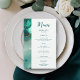 Um modelo de cardápio de praia que apresenta uma pintura, abstrato, de aquarela de uma praia e ondas com efeito de derrame de tinta dourada (o ouro é um efeito digital, não uma folha real!) e uma caligrafia moderna. Clássico e elegante, simples e moderno, é uma escolha adorável para um casamento de praia em qualquer estação, para um casal moderno.